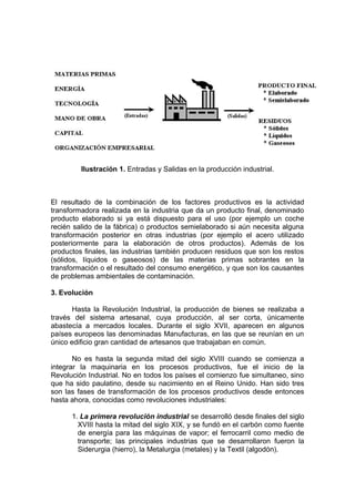 El documento describe la evolución de la industria desde los talleres artesanales hasta la revolución industrial moderna. Explica que la industria transforma las materias primas en productos mediante maquinaria, mano de obra y capital. Se detalla que existen diferentes tipos de industrias según su posición en la cadena de producción, el peso de las materias primas utilizadas y su grado de desarrollo. Finalmente, analiza los factores que influyen en la localización de las industrias y los problemas actuales como la obsolescencia y la contaminación