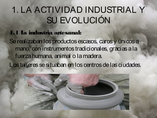 Este documento resume la evolución de la industria y los espacios industriales. Explica que la industria artesanal usaba instrumentos tradicionales y fuerza humana, mientras que la industria moderna usó maquinaria y energía para producir de forma masiva. La industria actual está automatizada y conectada a nuevas fuentes de energía. También describe los tipos principales de industrias y espacios industriales como polígonos y parques tecnológicos. Finalmente, analiza la globalización de la industria y la divis