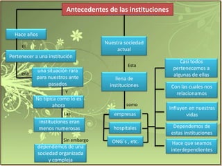 Este documento describe las instituciones en la sociedad. Explica que las instituciones surgen de las necesidades humanas y que casi todos pertenecemos e interactuamos con instituciones como empresas, hospitales u organizaciones no gubernamentales. También diferencia entre instituciones informales y formales, e instituciones públicas y privadas.