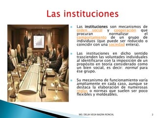 Las instituciones son mecanismos de orden social y cooperación que procuran normalizar el comportamiento de un grupo de individuos. Cumplen funciones como inculcar valores, satisfacer necesidades sociales específicas e imponer reglas aceptadas por todos sus integrantes. Algunas instituciones mencionadas son la familia, el mercado, la iglesia, la escuela, el poder judicial y los sindicatos.