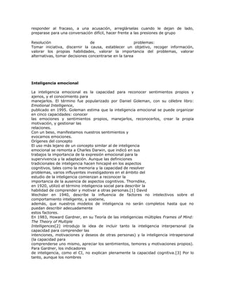 La inteligencia emocional se refiere a la capacidad de reconocer propios sentimientos y los de los demás, y de manejarlos. Fue popularizado por Daniel Goleman en su libro de 1995, donde lo define como la capacidad de conocer las propias emociones, manejarlas, reconocer las emociones ajenas, motivarse a uno mismo y gestionar relaciones. Investigadores previos como Thorndike y Gardner reconocieron la importancia de factores no cognitivos como la inteligencia social e intrapersonal.