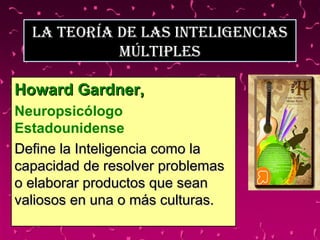 La teoría de las inteligencias múltiples de Howard Gardner propone que existen ocho tipos de inteligencia: lógico-matemática, lingüística, corporal-kinestésica, musical, espacial, naturalista, interpersonal e intrapersonal. Según Gardner, la inteligencia se define como la capacidad de resolver problemas o crear productos valiosos en una o más culturas. La teoría sugiere que debido a la existencia de múltiples inteligencias, los métodos de enseñanza deben permitir el acceso al conocimiento a