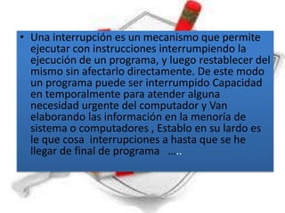 El documento habla sobre las interrupciones en sistemas computacionales. Las interrupciones permiten ejecutar instrucciones interrumpiendo temporalmente un programa para atender otras necesidades del sistema antes de continuar con el programa original. Existen interrupciones internas generadas por eventos de hardware y externas de periféricos como teclado e impresoras. El hardware controla las interrupciones internas mientras que el circuito PIC 8259A controla las externas usando puertos de comunicación.