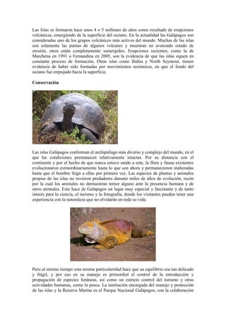 Las Islas Galápagos se encuentran a 970 km de Ecuador y consisten en 13 islas mayores, 6 menores y varios islotes. La mayor isla es Isabela y el 97% de las islas están protegidas como Parque Nacional Galápagos. Las islas se formaron hace 4-5 millones de años por actividad volcánica y su flora y fauna evolucionaron de manera única debido a su aislamiento. La vida salvaje incluye aves, mamíferos y reptiles endémicos, pero especies introducidas ahora amenazan el delic