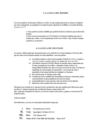 Las cuatro jaulas espirituales principales son: 1) la lujuria, 2) el temor, 3) el amor al dinero, y 4) los celos. La Biblia ofrece varios ejemplos de personas atrapadas en estas jaulas, como el rey Salomón con la lujuria y Saúl con el temor. Para liberarse, debemos orar, estar alerta, huir del pecado, y amar a Dios sobre todas las cosas. Solo a través de Cristo y el Espíritu Santo podemos alcanzar la verdadera libertad.