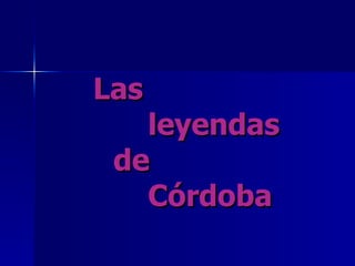 Este documento presenta varias leyendas de Córdoba, incluyendo la del caimán de la Fuensanta, el Cristo de la Misericordia, el niño mártir de Puente Genil, la estrella de los deseos y la ternera descabezada. También resume la leyenda de los siete infantes de Lara y cómo fueron traicionados y decapitados.