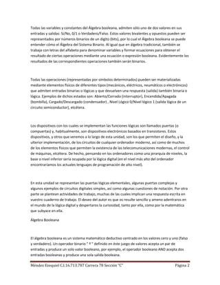 El documento trata sobre álgebras booleanas. Estas constituyen un área matemática estudiada por George Boole que es fundamental para la lógica digital y el diseño de circuitos. Las álgebras booleanas usan solo dos valores (verdadero/falso) y operaciones lógicas como AND, OR y NOT. Estas operaciones pueden implementarse físicamente en circuitos electrónicos.