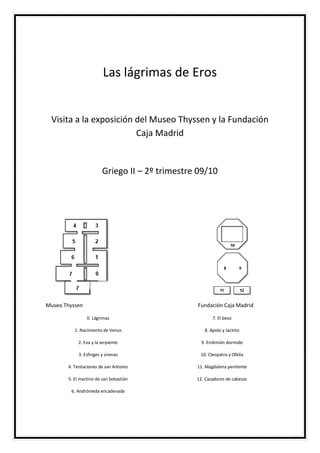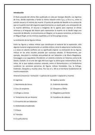 Este documento resume una exposición en el Museo Thyssen sobre la representación de mitos griegos y bíblicos relacionados con el erotismo y la muerte. Explica cómo estas figuras míticas han sido reinterpretadas a lo largo de los siglos, especialmente en el arte del siglo XIX, cuando tomaron significados más perversos. Además, guía al visitante a través de las diferentes salas de la exposición, resumiendo cada obra y relacionándola con su mito correspondiente.