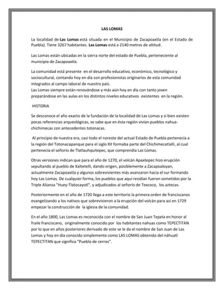 Este documento presenta información sobre la localidad de Las Lomas en el estado de Puebla, México. Describe su ubicación geográfica, historia, tradiciones, cultura, educación y clima. También incluye detalles sobre la escuela primaria Venustiano Carranza en Las Lomas, así como la justificación y propósito de implementar estrategias innovadoras en la enseñanza, en particular el uso de canciones y cuentos para enseñar el orden alfabético en español.
