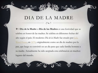 El documento habla sobre el Día de la Madre. Explica que se celebra en diferentes fechas según el país y que fue creado originalmente por Julia Ward Howe en 1870 como un día para honrar a las madres. También describe los antecedentes históricos de esta celebración, remontándose a la antigua Grecia donde se le rendían honores a Rea, la madre de los dioses, y cómo los romanos también celebraron este día llamándolo Hilaria.