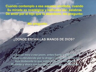 El poema reflexiona sobre la injusticia, el sufrimiento y el abandono que existe en el mundo. El autor se pregunta dónde están las manos de Dios ante tales problemas. Al final, Dios le responde que las manos de Dios somos todos nosotros, y que debemos usarlas para dar amor y luchar por un mundo más justo.