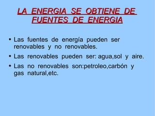 El documento trata sobre la energía y las máquinas, diferenciando entre fuentes renovables (agua, sol, aire) y no renovables (petróleo, carbón, gas natural). Se clasifican las máquinas en simples (polea, palanca, rueda) y compuestas (ordenador, bicicleta), y se menciona su evolución histórica en la construcción de herramientas. Además, se destaca la importancia de las máquinas en la facilitación del trabajo en diversos entornos como casa, escuela y mercado.
