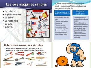 Las máquinas reducen el esfuerzo necesario para realizar un trabajo. Contienen componentes como la estructura, carcasa, motor, circuitos eléctricos y mecanismos que transmiten fuerzas y movimientos. Las máquinas realizan cuatro movimientos básicos: lineal, rotativo, alternativo y oscilante. La tecnología aplica el conocimiento de las máquinas para mejorar la vida diaria, la alimentación, el ocio y las comunicaciones.