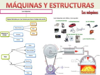 Las máquinas son dispositivos que facilitan el trabajo al reducir el esfuerzo requerido, compuestos por diversos componentes como motores, circuitos y mecanismos. La tecnología derivada de estas máquinas mejora la calidad de vida, aumentando la eficiencia en el hogar, la alimentación, el ocio y las comunicaciones. Las estructuras, por su parte, son conjuntos estabilizados que soportan fuerzas y se clasifican según los elementos que predominan en ellas, como columnas y arcos, y su estabilidad depende del centro de gravedad.