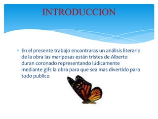 Este documento presenta un análisis literario de la obra "Las mariposas están tristes" de Alberto Duran Coronado a través de un mariposario representado con gifs. El documento describe los objetivos, elementos de la narrativa como tema, personajes, tiempo y espacio. También incluye una tabla con ejemplos de sustantivos, adjetivos y verbos encontrados en la obra.