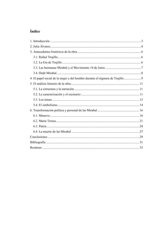 Este documento presenta un resumen de la tesis de grado de Mari-Liisa Toomasson sobre la novela "En el tiempo de las Mariposas" de Julia Álvarez. Explora la transformación política y personal de las hermanas Mirabal de mujeres comunes a revolucionarias durante la dictadura de Rafael Trujillo en República Dominicana. Incluye información sobre la autora Julia Álvarez, el contexto histórico bajo Trujillo, y un análisis literario de la obra que examina la caracterización y el viaje de las hermanas Mira