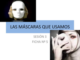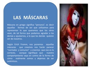 El documento habla sobre las máscaras que usamos para ocultar nuestros verdaderos sentimientos y personalidad. Describe varias máscaras comunes como el indiferente, el payaso, el agresivo, el inocente, el crítico, el confundido, el pesimista y el popular. Detrás de cada máscara hay miedos como al rechazo, fracaso o compromiso. Usar máscaras nos aleja de nuestra autenticidad y puede causar frustración y ansiedad.