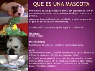 Este documento describe diferentes tipos de mascotas que pueden mantenerse en cautiverio, incluyendo perros, gatos, conejillos de india, hámsters, conejos enanos, aves como canarios y loros, tortugas y peces. Explica que no todas las especies son adecuadas como mascotas y que al adoptar un animal es importante investigar sus necesidades para brindarle el cuidado adecuado.
