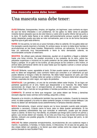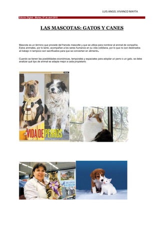 El documento habla sobre las mascotas más comunes, gatos y perros. Explica que una mascota es un animal de compañía y no está destinado al trabajo o al sacrificio para alimento. También analiza los factores a considerar al adoptar un gato o perro, como sus necesidades, tamaño, actividad y si es cachorro o adulto. Además, describe los rasgos de una mascota sana y las diferencias entre perros y gatos.