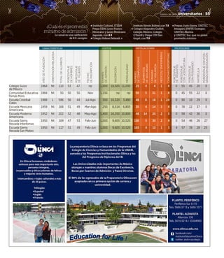 El documento presenta información sobre diversas características de diferentes preparatorias en México, incluyendo el año de fundación, orientación religiosa, número total de alumnos, mensualidad, número de computadoras, elementos de seguridad, instalaciones deportivas, personal médico, porcentajes de pasantes y egresados con licenciatura o posgrado, costos de colegiatura, entre otros datos.
