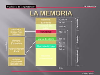 El documento describe los diferentes tipos de memoria utilizados en computadoras. Explica la memoria SDRAM, DDR SDRAM y DDR2 SDRAM, incluyendo sus características como velocidad, voltaje y forma de implementación. También describe la memoria caché y cómo mejora el rendimiento al almacenar datos comúnmente utilizados para un rápido acceso.