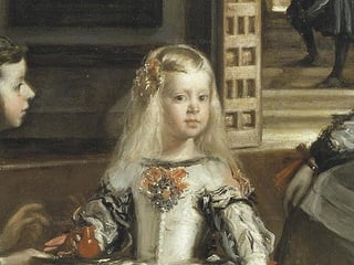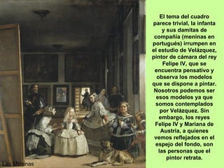 Este documento resume la obra maestra de Velázquez "Las Meninas", pintada en 1656. En ella se representa a la infanta Margarita con sus damas de compañía en el estudio del pintor. A través de un espejo se reflejan los reyes Felipe IV y Mariana de Austria, a quien Velázquez está retratando. La obra es considerada una de las cumbres de la pintura universal por su compleja composición y uso magistral de la perspectiva.