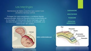 Este documento describe las membranas meníngeas que cubren el sistema nervioso central, incluyendo la duramadre, aracnoides y piamadre. También describe los ventrículos cerebrales, la irrigación sanguínea del cerebro a través de las arterias carótidas y vertebrales, el drenaje venoso a través de los senos venosos, y otros temas relacionados con la anatomía del sistema nervioso central.