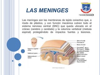 Este documento describe las meninges y el sistema ventricular del cerebro. Las meninges son las tres membranas que cubren y protegen el cerebro y la médula espinal: la duramadre, la aracnóide y la piamadre. El sistema ventricular se refiere a los cuatro ventrículos dentro del cerebro y la médula espinal donde se produce y circula el líquido cefalorraquídeo.