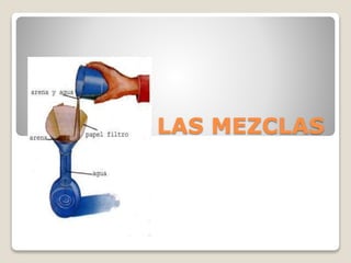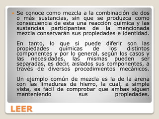 Este documento describe las características de las mezclas, incluyendo que son combinaciones de sustancias sin reacción química donde los componentes mantienen sus propiedades. Existen dos tipos de mezclas: homogéneas donde los componentes no se pueden distinguir visualmente y heterogéneas donde los componentes se pueden distinguir. Algunos ejemplos de mezclas homogéneas son soluciones y de heterogéneas son la madera y el agua.