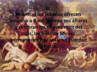 Mientras las miníades desatienden la celebración en honor a Baco, cuentan tres historias de amor trágico: la de Píramo y Tisbe, la traición de Venus y Marte, y el amor no correspondido de Sálmacis por Hermafrodito. Cada relato culmina en fatalidades y transformaciones, reflejando las consecuencias de desobedecer a los dioses. Al final, Baco transforma a las miníades en murciélagos, reconociendo su divinidad por los habitantes de Tebas.