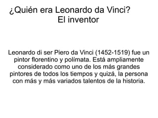 Leonardo da Vinci fue un pintor e inventor del Renacimiento conocido por sus diseños de máquinas de vuelo, de guerra y mecánicas. Diseñó alas batientes, un tornillo aéreo, una catapulta, un tanque, la bicicleta y máquinas hidráulicas como una draga y un barco de palas, aunque muchas de sus invenciones no pudieron construirse debido a las limitaciones tecnológicas de su época.