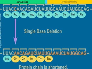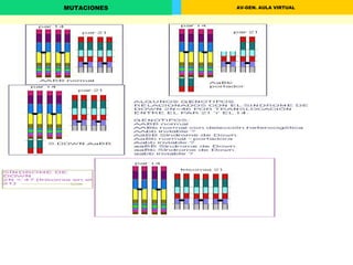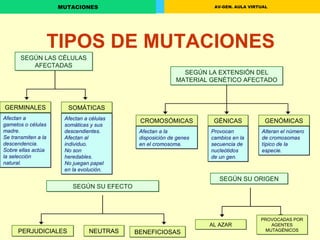 Las mutaciones son cambios al azar o provocados en el material genético celular que tienen baja probabilidad en organismos superiores y mayor en bacterias y virus. Pueden ser espontáneas o inducidas por agentes mutagénicos como radiaciones o químicos. Las mutaciones pueden ser génicas, cromosómicas o genómicas y tener efectos neutros, perjudiciales o beneficiosos.