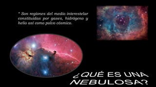 Las nebulosas se encuentran en los discos de las galaxias espirales y en cualquier zona de las galaxias irregulares. Están compuestas de gas y polvo que se hacen tan grandes que colapsan bajo su propia gravedad, calentando el material en el centro y dando comienzo a una estrella. Existen cuatro tipos principales de nebulosas: oscuras, de reflexión, de emisión y planetarias.