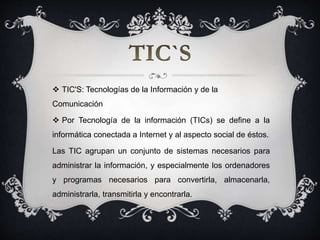 Las Tecnologías de la Información y Comunicación (TIC) incluyen la informática conectada a Internet y su aspecto social. Las TIC agrupan sistemas necesarios para administrar información como ordenadores y programas. Su introducción implica un cambio social hacia una sociedad de la información. Las TIC también proveen herramientas que permiten redefinir el funcionamiento de la sociedad en áreas como la educación.