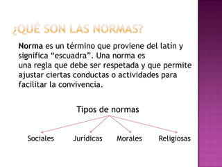 Las normas surgen para facilitar la convivencia humana y existen diferentes tipos como las sociales, jurídicas, morales y religiosas. Sirven para regular la conducta y garantizar derechos, aunque su incumplimiento puede conllevar sanciones dependiendo del tipo de norma. Las normas han existido a lo largo de la historia en todas las culturas porque son necesarias para que los grupos humanos puedan coexistir.