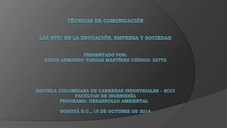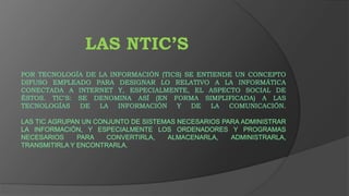 Las NTIC son herramientas computacionales e informáticas que procesan y presentan información. Han impactado la educación al modificar las formas de enseñar y aprender, aunque no todas las instituciones educativas tienen los recursos para aprovecharlas. También han transformado el trabajo y la gestión de recursos en las empresas, haciéndolas más productivas. En la sociedad, las NTIC tienen ventajas como el fácil acceso a información pero también desventajas como la brecha digital y dependencia tecnológica.