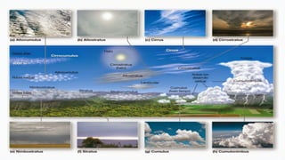 Las nubes se forman cuando el aire caliente y húmedo se eleva y enfría, condensando el vapor de agua en gotitas líquidas o cristales de hielo. Se clasifican en tres familias - nubes altas, medias y bajas - dependiendo de su altitud, y tienen formas como cirros, cúmulos y estratos. Las nubes se originan en áreas de baja presión donde las corrientes verticales elevan el aire húmedo.