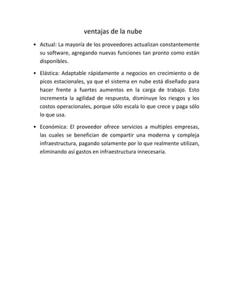 La computación en nube permite que los consumidores y empresas gestionen archivos y utilicen aplicaciones almacenadas en centros de datos remotos y accedidas a través de Internet, sin necesidad de instalar software. Ofrece un uso más eficiente de recursos como almacenamiento, memoria y ancho de banda al proveer solo los recursos necesarios. El término "nube" se usa como metáfora de Internet para representar los recursos de forma abstracta.