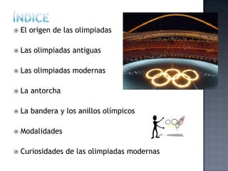 Este documento resume la historia de las Olimpiadas antiguas y modernas. Comenzaron en el siglo VIII a.C. en Grecia como competiciones atléticas entre ciudades-estado. Las Olimpiadas modernas fueron revividas en 1896 en Atenas por iniciativa de Pierre de Coubertin. Actualmente se celebran cada cuatro años y comprenden una gran variedad de deportes con cientos de competidores de todo el mundo.