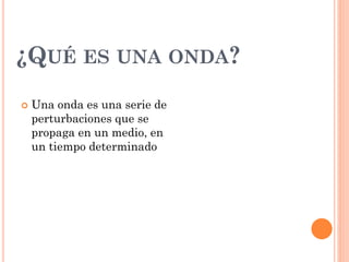 Este documento describe diferentes tipos de ondas. Define una onda como una serie de perturbaciones que se propagan en un medio. Clasifica las ondas en transversales y longitudinales según cómo vibran sus partículas, y en mecánicas, electromagnéticas, viajeras, estacionarias y armónicas según su naturaleza de propagación. Explica brevemente cada tipo de onda.