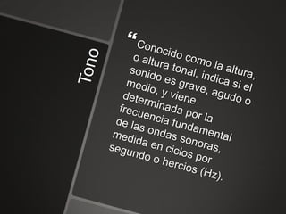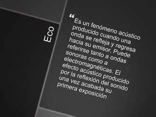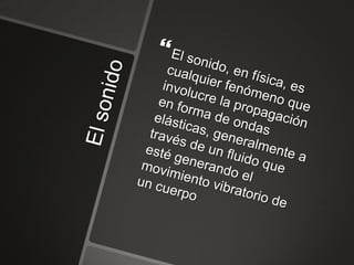 El documento habla sobre la física del sonido. Explica que el sonido se propaga a través de la materia en forma de ondas mecánicas sin transporte de materia. La velocidad del sonido depende de las características del medio como la presión, temperatura y densidad. También describe la reverberación como el fenómeno de la reflexión del sonido una vez que la fuente ha dejado de emitirlo.