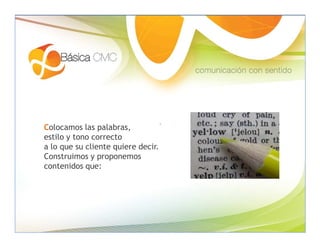 Este documento ofrece paquetes de servicios de contenido web para pequeñas empresas, incluido un paquete básico de $300,000 que proporciona contenido para las páginas principales de un sitio web. También se ofrecen servicios adicionales como blogs, boletines informativos y actualizaciones de sitios web. El documento proporciona detalles sobre los servicios incluidos en cada paquete y cómo ponerse en contacto con la compañía.