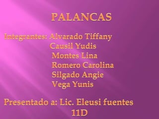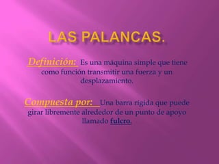 La palanca es una máquina simple compuesta por una barra rígida que gira alrededor de un punto de apoyo llamado fulcro. Actúan sobre la palanca tres fuerzas: la potencia, la resistencia y la fuerza de apoyo. La ley de la palanca establece que la potencia multiplicada por su brazo es igual a la resistencia multiplicada por su brazo. Las palancas se dividen en tres clases dependiendo de la posición relativa de la potencia y la resistencia con respecto al fulcro.