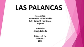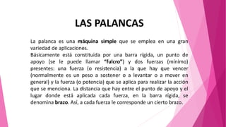 Este documento describe las palancas, incluyendo sus elementos principales (punto de apoyo, brazo de potencia, brazo de resistencia), los tres tipos de palancas (primera, segunda y tercera clase), y la ley fundamental de las palancas que establece que el producto de la fuerza por su brazo es igual para la fuerza aplicada y la fuerza a vencer.