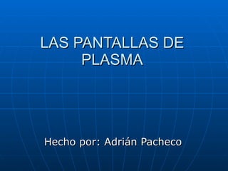 Este documento describe las pantallas de plasma, incluyendo su historia, funcionamiento, consumo energético y ventajas/desventajas frente a las pantallas LCD. Las pantallas de plasma se inventaron en 1964 y funcionan mediante una mezcla de gases que produce plasma y emite luz. Si bien ofrecen una amplia gama de colores, su mayor consumo energético y menor vida útil son desventajas frente a las pantallas LCD.