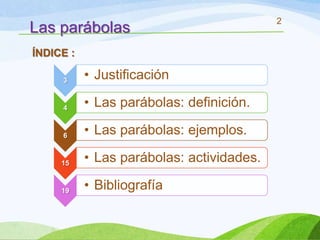 Este documento presenta una introducción a las parábolas de Jesús. Explica que las parábolas son historias cortas que Jesús contó para enseñar valores a sus seguidores de una manera sencilla. Luego, resume tres parábolas bíblicas conocidas como ejemplos: el grano de mostaza, la oveja perdida y la red de pescadores. Finalmente, propone algunas actividades para trabajar estas parábolas en el aula.