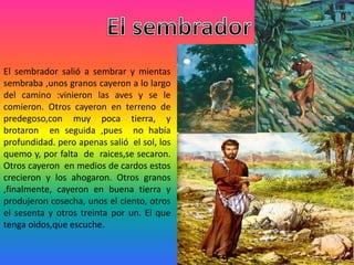 Este documento presenta resúmenes de varias parábolas de Jesús narradas en el Evangelio. Entre ellas se encuentran las parábolas del sembrador, el buen samaritano, la oveja perdida y el hijo pródigo. El documento analiza las enseñanzas y lecciones que Jesús quiso transmitir a través de estas historias.