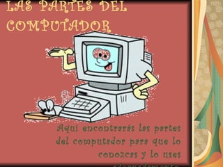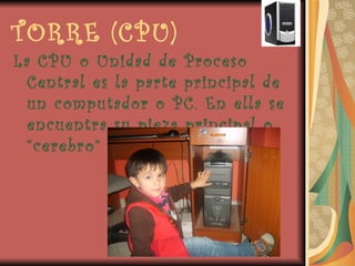 El documento describe las principales partes de un computador, incluyendo la torre (CPU), el monitor, el ratón, el teclado, la impresora, los parlantes, el scanner y la cámara web. También menciona los elementos de entrada como el teclado, ratón y scanner; los elementos de proceso como la CPU, disco duro y discos; y los elementos de salida como el monitor, parlantes e impresoras.