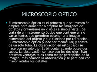 El microscopio óptico es un instrumento que utiliza lentes para aumentar imágenes de objetos no visibles a simple vista. Está compuesto de tres sistemas: mecánico, óptico e iluminación. El sistema óptico contiene lentes que producen el aumento de imágenes, mientras que el sistema mecánico permite el movimiento y enfoque de las lentes. El microscopio puede ser monocular o binocular y contiene partes como el ocular, objetivo, tubo óptico y platina para observar las muestras.