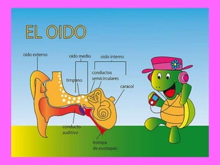El oído está dividido en tres partes: el oído externo que capta el sonido, el oído medio que produce el sonido y contiene el tímpano, y el oído interno que transporta el sonido a través del nervio auditivo hasta el cerebro.